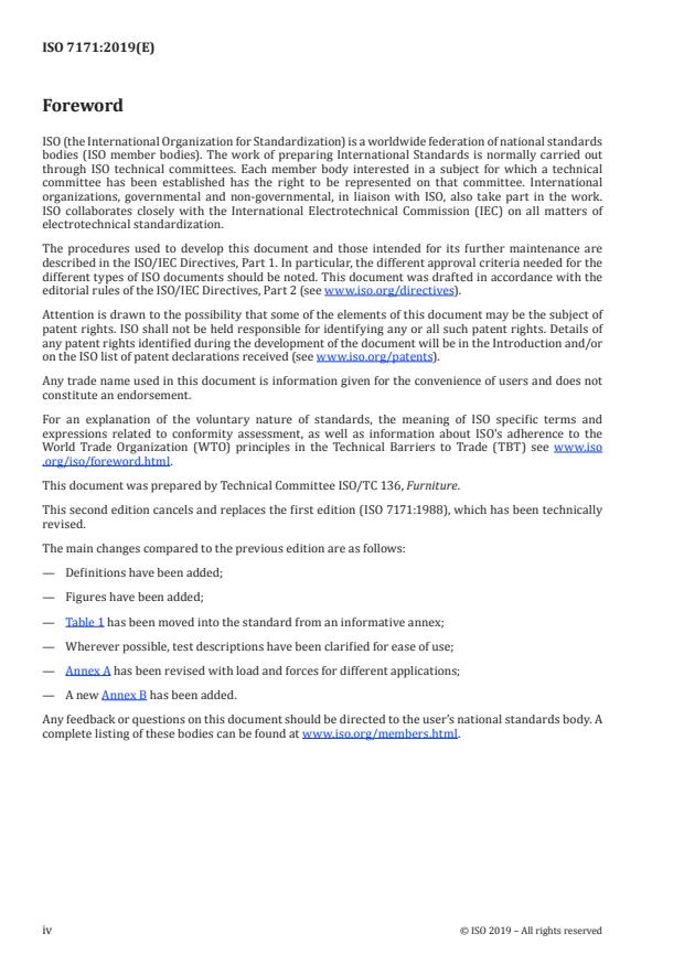 ISO 7171:2019 is a standard published by the International Organization for Standardization (ISO). Its full title is "Furniture — Storage units — Test methods for the determination of stability". This standard covers: This document specifies test methods for determining the stability of free-standing storage units that are fully assembled and ready for use. The test results are only valid for the unit/component tested. These results can be used to represent the performance of production models provided that the tested model is representative of the production model. This document specifies test methods only. It does not specify requirements for specific forces that the storage unit must withstand without overturning. It is intended that these be specified in a requirements document.