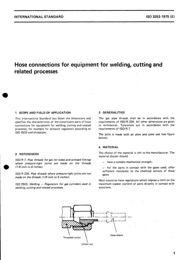 ISO 3253:1975 is a standard published by the International Organization for Standardization (ISO). Its full title is "Hose connections for equipment for welding, cutting and related processes". This standard covers: Hose connections for equipment for welding, cutting and related processes