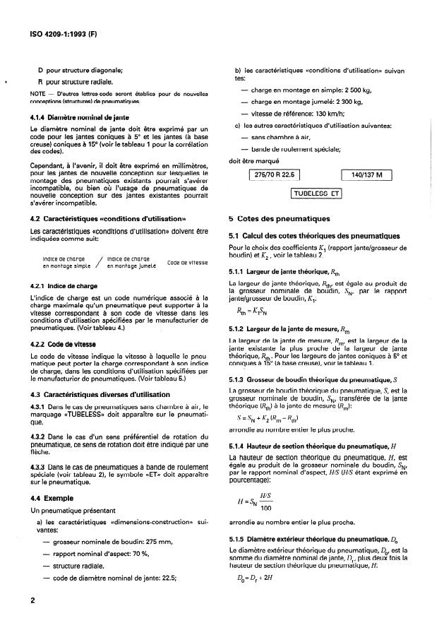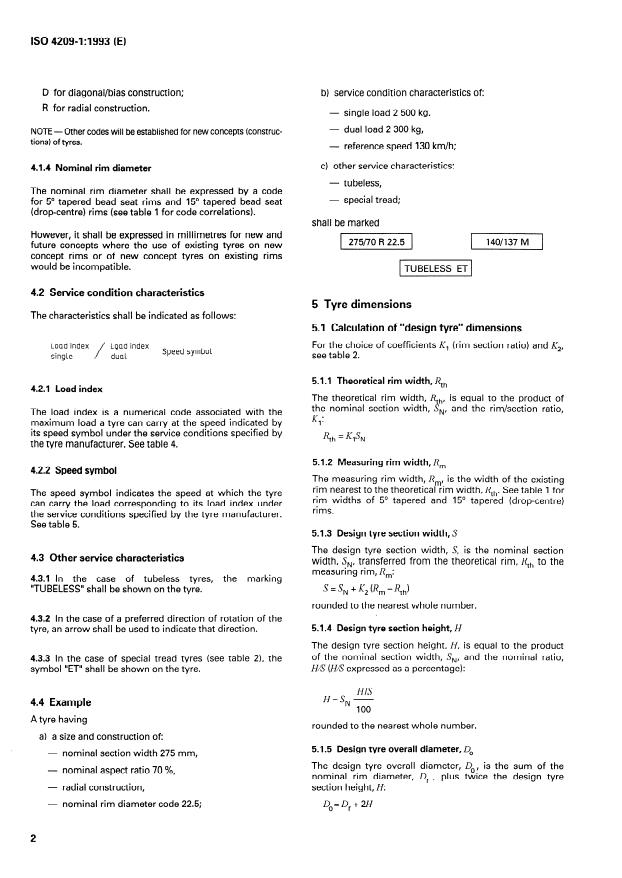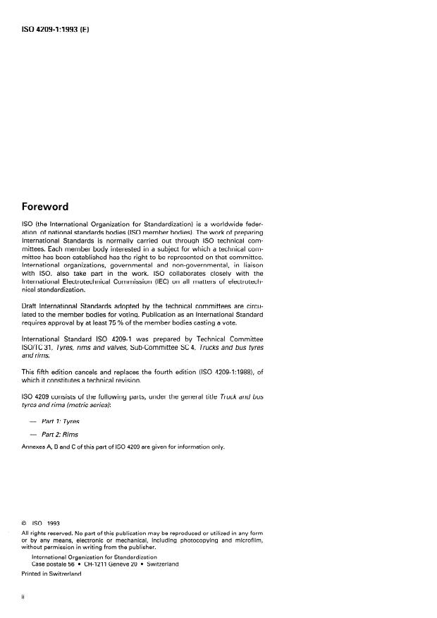 ISO 4209-1:1993 is a standard published by the International Organization for Standardization (ISO). Its full title is "Truck and bus tyres and rims (metric series) — Part 1: Tyres". This standard covers: This part specifies the designation, dimensions, and load ratings of tyres primarily intended for trucks and buses. It applies to bias-belted, diagonal and radial tyres mounted on 5° tapered rims and on 15° tapered (drop-centre) rims. It is also applicable to different concepts and types of tyres and rims; in these cases, however, appropriate rim/section ratios, coefficients, and construction codes have been added to tables 2 and 3.