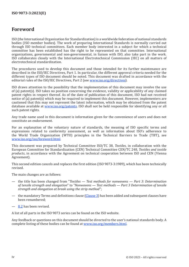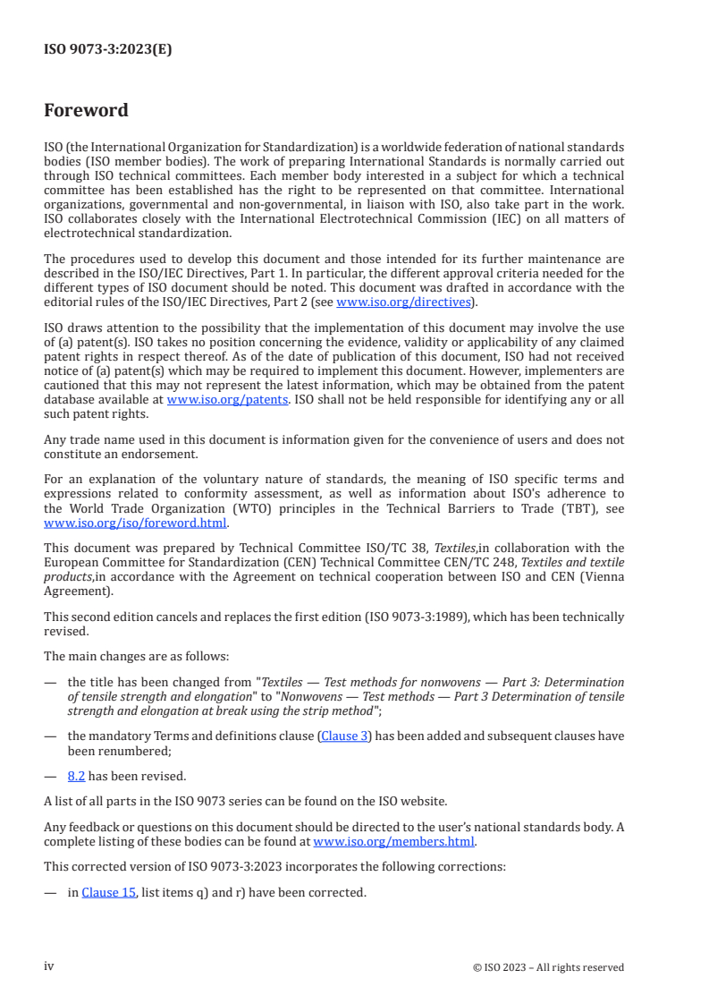 ISO 9073-3:2023 is a standard published by the International Organization for Standardization (ISO). Its full title is "Nonwovens - Test methods - Part 3: Determination of tensile strength and elongation at break using the strip method". This standard covers: This document specifies a test method for the determination of the breaking force and elongation of nonwovens using a strip method in conditioned or wet state. This test method describes two procedures, Option A (width of test specimen: 25 mm) and Option B (width of test specimen: 50 mm). This document specifies methods using constant rate of specimen extension (CRE) tensile testers. Constant rate of loading (CRL) instruments is covered, for information, in ISO 2062:2009, Annex A, in recognition of the fact that these instruments are still in use and can be used by agreement.