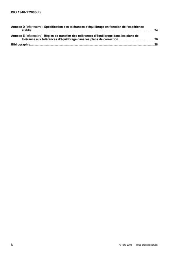 L'ISO 1940-1:2003 donne des spécifications pour les rotors en état rigide (constant). Elle spécifie les tolérances d'équilibrage, le nombre de plans de correction nécessaires, et des méthodes permettant de vérifier le balourd résiduel. Des recommandations relatives à la qualité des rotors équilibrés en état rigide (constant) sont aussi données, en fonction de leur type et de leur vitesse nominale maximale. Ces recommandations reposent sur une expérience mondiale. L'ISO 1940-1:2003 se propose également de faciliter les relations entre le constructeur et l'utilisateur des machines tournantes, en définissant des critères d'acceptation pour la vérification des balourds résiduels. Des compléments concernant les erreurs associées à l'équilibrage et à la détermination du balourd résiduel sont donnés dans l'ISO 1940-2. L'ISO 1940-1:2003 ne concerne pas les rotors à l'état flexible. Les critères de qualité d'un rotor équilibré à l'état flexible sont définies dans l'ISO 11342.