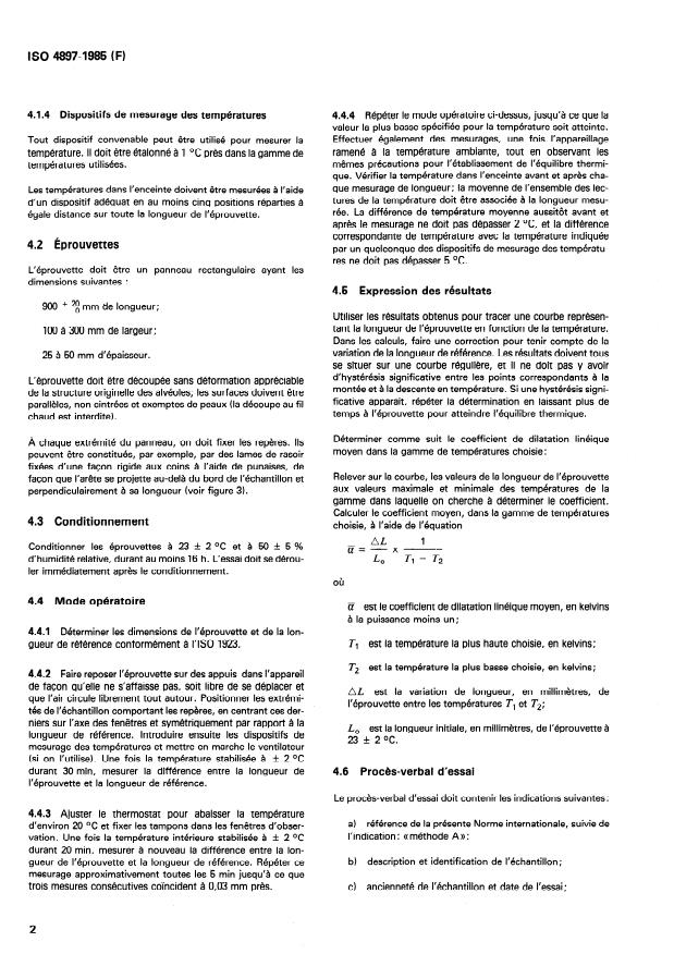 Specifies two methods for determing the coefficient of linear thermal expansion. Method A is the preferred method, it gives a value on a large sample at a chosen temperature. Method B should be employed to obtain an average coefficient for the temperature interval between the cryogenic temperature and the ambient temperature. In an annex the test apparatures for both methods are described in detail.