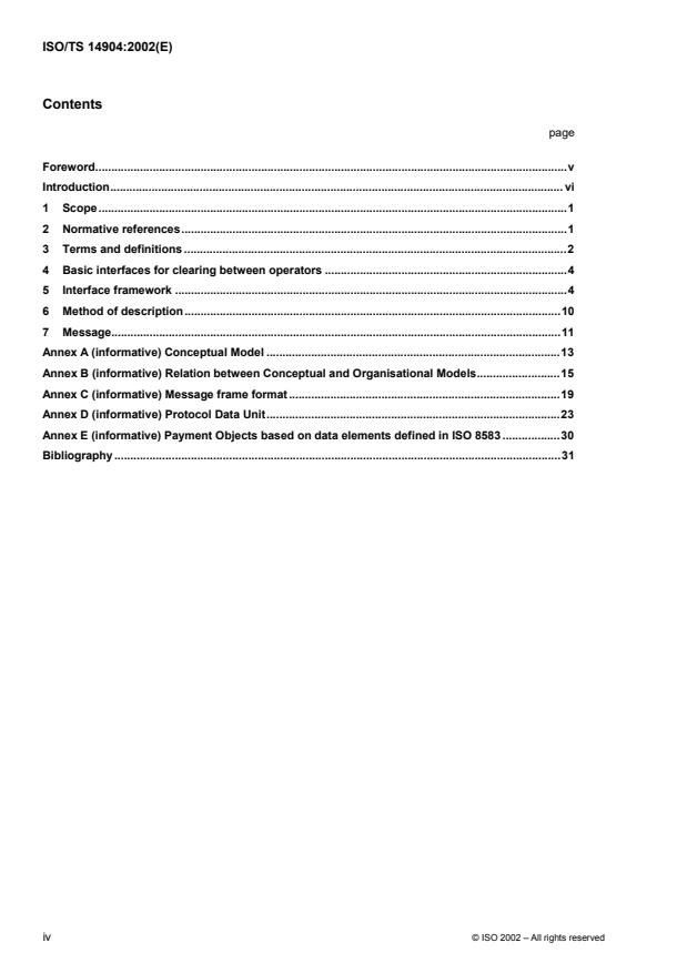 ISO/TS 14904:2002 specifies the interfaces for clearing between operators and gives a framework of the common message structure and data elements to be used on the interfaces. Its objective is to make the transfer of payment and Electronic Fee Collection (EFC) related data possible both between different payment systems and between different operators such as collection agents, clearing operators, or providers of public and private transport services. ISO/TS 14904:2002 supports: different payment modes (e.g. pre-payment, post-payment); a wide variety of transport and transport related services (tolling, parking, ferry/bridge/tunnel, public transport, payment for route guidance etc.); operator services (co-ordination between collectors of money and charge points etc.); security and privacy. It is not within the scope of ISO/TS 14904:2002 to define administrative procedures and organisational structures. The specification of a higher (e.g. pan-European) level inter-operable payment system is outside the scope of ISO/TS 14904:2002. Not described within ISO/TS 14904:2002 are indirect (external) participants such as authorities, enacting general or special legislation concerning the payment system and other national regulations. The models presented in this standard are generic. Simple systems (closed systems) can be designed by selecting subsets of the interface framework described herein.