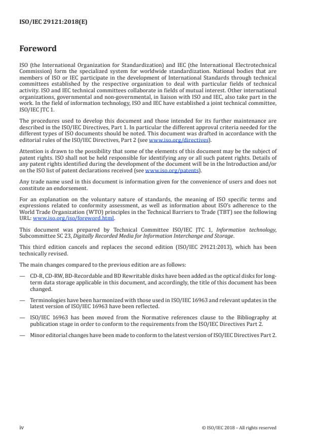 ISO/IEC 29121:2018 is a standard published by the International Organization for Standardization (ISO). Its full title is "Information technology — Digitally recorded media for information interchange and storage — Data migration method for optical disks for long-term data storage". This standard covers: ISO/IEC 29121:2018 specifies the data migration method for DVD-R, DVD-RW, DVD-RAM, +R, +RW, CD-R, CD-RW, BD Recordable and BD Rewritable disks for long-term data storage. By applying this document for information storage, digital data can be migrated to a next new disk without loss from the present disk as long as data errors are completely corrected before and during the migration and provided copying of the data is allowed. ISO/IEC 29121:2018 specifies: - a data migration method for long-term data storage; - test methods including test parameters, test area, test drive, disk preparation and test execution; - an initial performance test and a periodic performance test that check a readability of the data recorded on the disks with categorized Maximum Data Error tables; and - a necessity of precaution to reduce the possibility of deterioration in order to assure the integrity of the disks during their use, storage, handling or transportation. ISO/IEC 29121:2018 offers guidelines to use disks with estimated lifetime of Bmig (B0,000 1) Life which is introduced using B5 Life and B50 Life specified in ISO/IEC 16963.