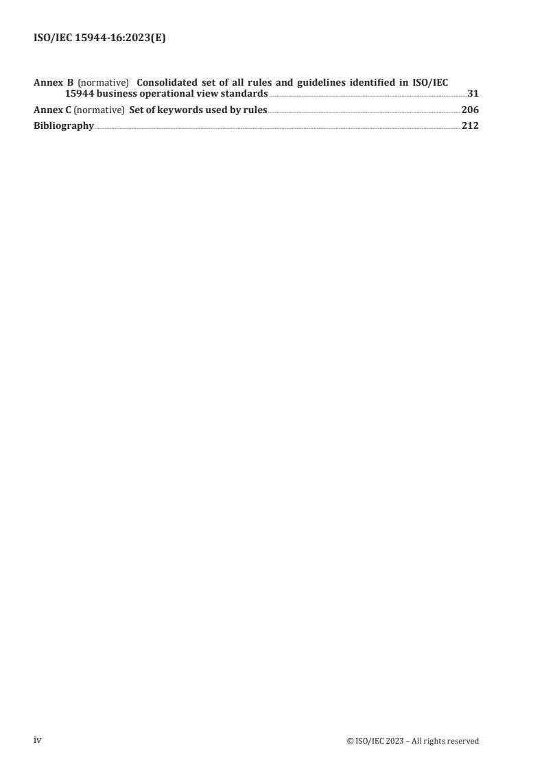 ISO/IEC 15944-16:2023 consolidates the rules and associated guidelines defined across the ISO/IEC 15944 Business Operational View (BOV) series into a single, IT‑enable framework. The standard provides a unified BOV rulebase model, unique eBusiness rule IDs, and a systematic approach to capture, manage and use BOV rules and guidelines while remaining technology‑neutral. It also includes normative annexes for a controlled vocabulary, a consolidated rule/guideline list and a keyword set to support semantic interoperability.