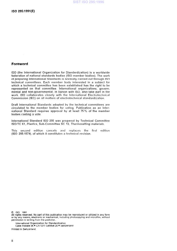 ISO 295:1991 is a standard published by the International Organization for Standardization (ISO). Its full title is "Plastics — Compression moulding of test specimens of thermosetting materials". This standard covers: Specifies the general principles and the procedures for the preparation of test specimens and for the establishment of comparable test reports from different testing organizations. This second edition cancels and replaces the first edition (1974).
