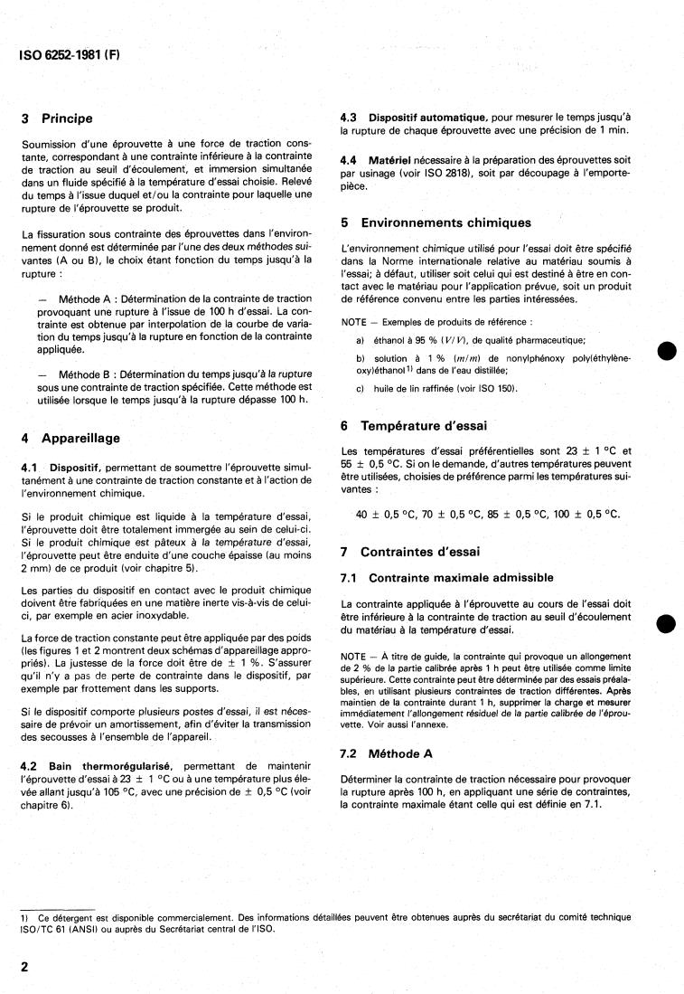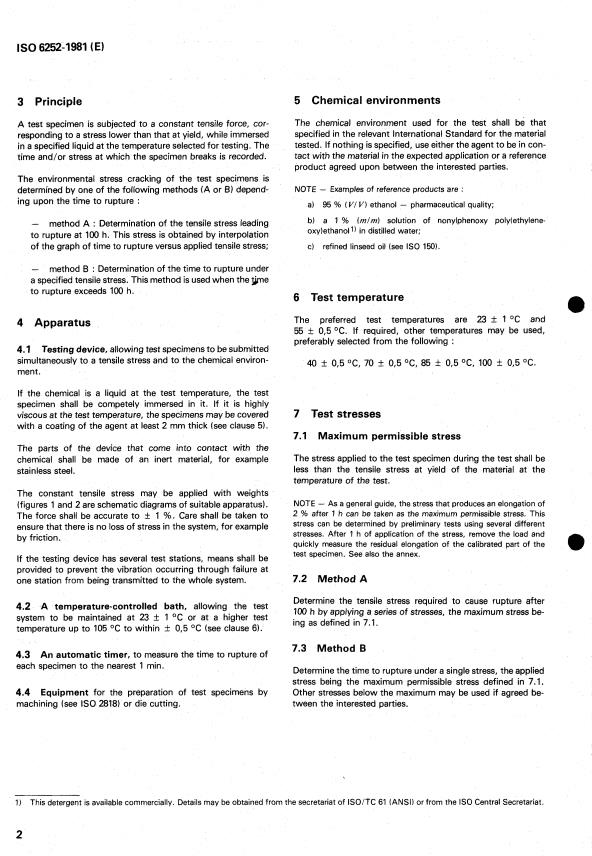 ISO 6252:1981 is a standard published by the International Organization for Standardization (ISO). Its full title is "Plastics — Determination of environmental stress cracking (ESC) — Constant tensile stress method". This standard covers: Plastics — Determination of environmental stress cracking (ESC) — Constant tensile stress method