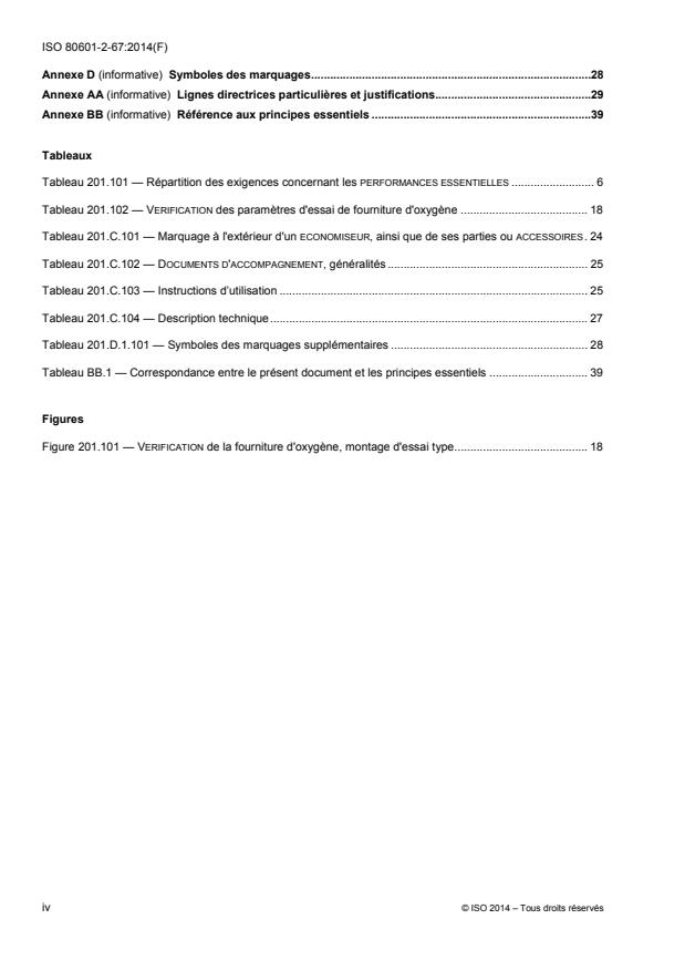 L'ISO 80601-2-67:2014 s'applique à la securité de base et aux performances essentielles d'un economiseur d'oxygène, désigné ci-après sous le terme d'appareil em, ainsi que de ses accessoires prévus pour économiser le supplément d'oxygène en délivrant du gaz de manière intermittente et synchronisée en suivant le cycle d'inspiration du patient, pour une utilisation dans l'environnement de soins a domicile. L'economiseur d'oxygène est habituellement utilisé par un operateur non specialiste. L'ISO 80601-2-67:2014 s'applique également aux accessoires destinés par leur fabricant à être raccordés à un economiseur, du fait que les caractéristiques de ces accessoires peuvent avoir un impact sur la securite de base ou sur les performances essentielles de l'economiseur.