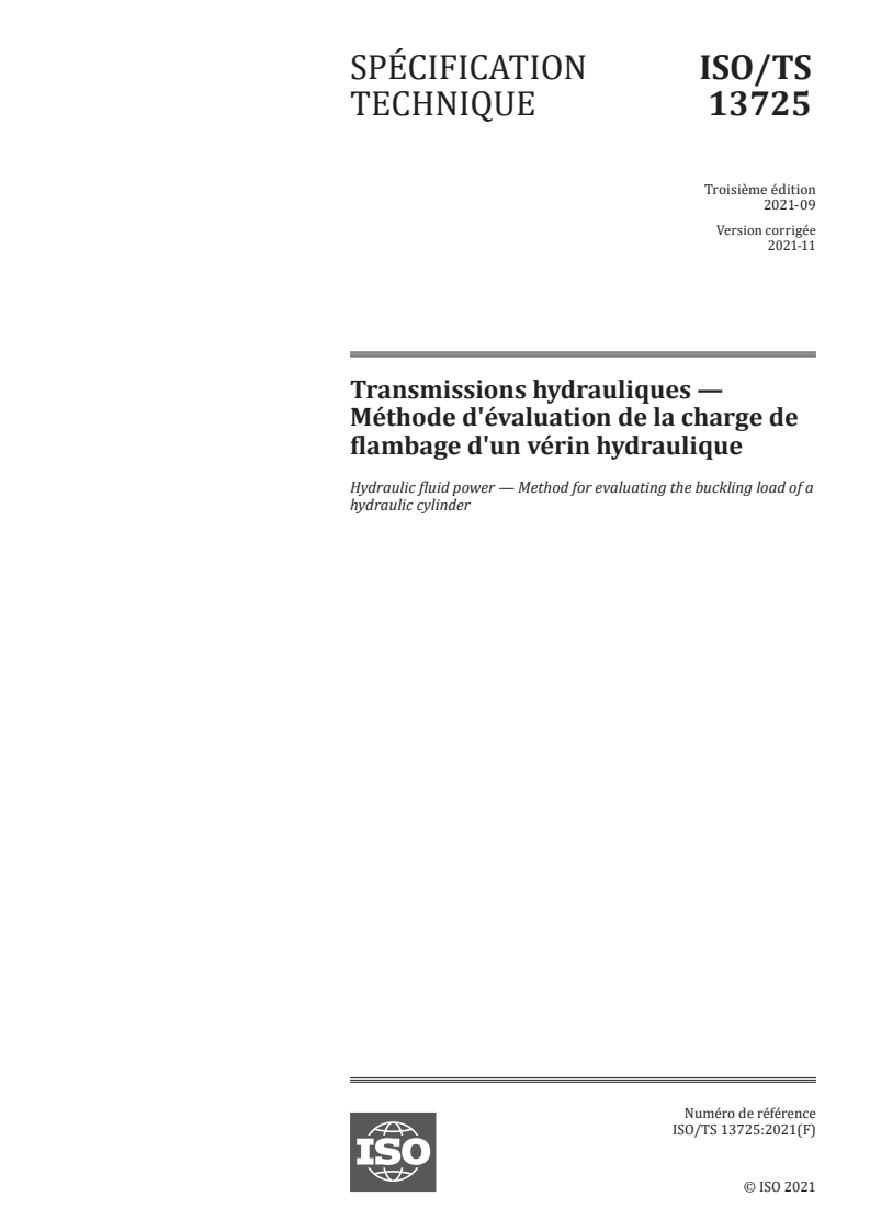 ISO/TS 13725:2021 - Transmissions hydrauliques — Méthode d'évaluation de la charge de flambage d'un vérin hydraulique Released:11/22/2021