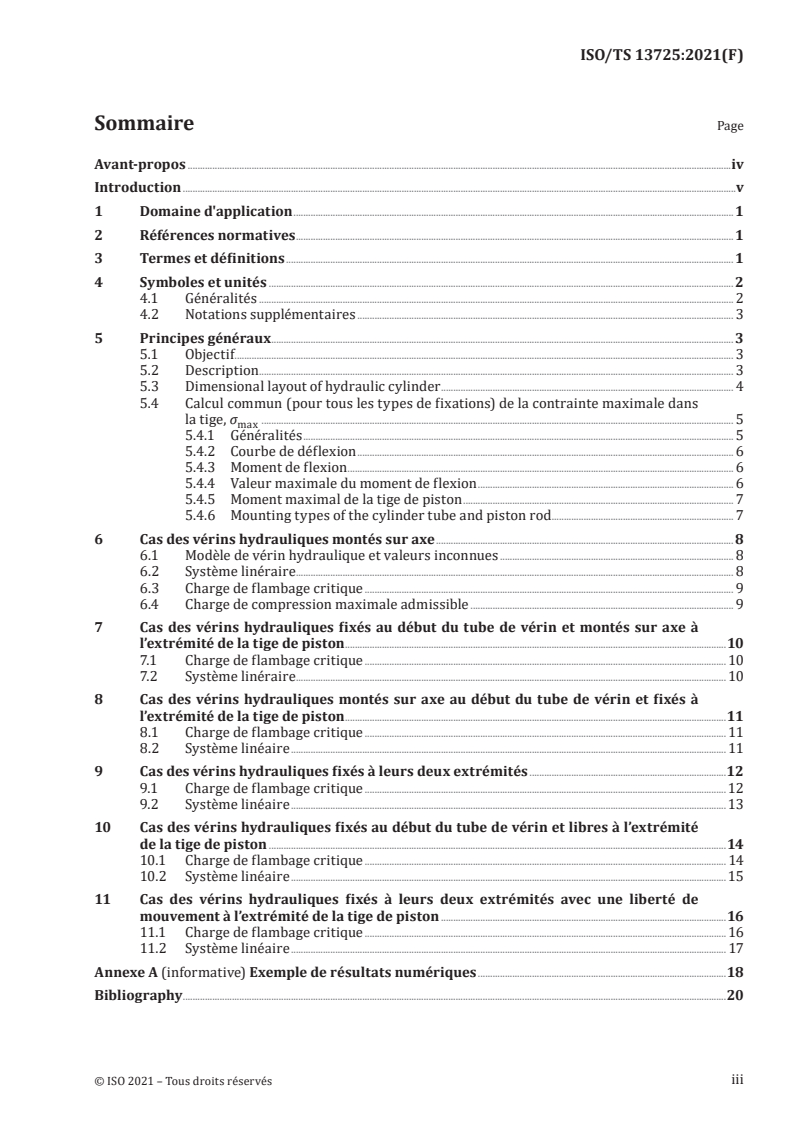 This document specifies a method for the evaluation of the buckling load which: a) takes into account a geometric model of the hydraulic cylinder, meaning it does not treat the hydraulic cylinder as an equivalent column, b) can be used for all types of cylinder mounting and rod end connection specified in Table 2, c) includes a factor of safety, k, to be set by the person performing the calculations and reported with the results of the calculations, d) takes into account possible off-axis loading, e) takes into account the weight of the hydraulic cylinder, meaning it does not neglect all transverse loads applied on the hydraulic cylinder, f) can be implemented as a simple computer program, and g) considers the cylinder fully extended. The method specified is based on the elastic buckling theory and is applicable to single and double acting cylinders that conform to ISO 6020 (all parts), ISO 6022 and ISO 10762. If necessary, finite element analyses can be used to verify as well as to determine the buckling load. The method is not developed for thin-walled cylinders, double-rods or plunger cylinders. The method is not developed for internal (rod) buckling. The friction of spherical bearings is not taken into account. NOTE This method is based mainly on original work by Fred Hoblit[2]. This method has been established in reference to the standard NFPA/T3.6.37[1].