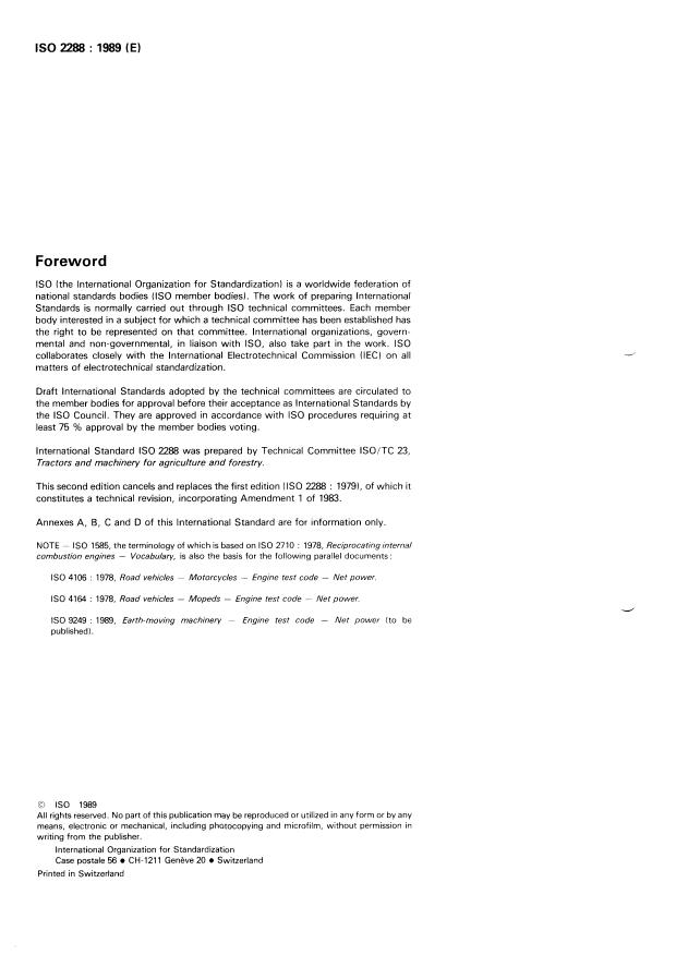 ISO 2288:1989 is a standard published by the International Organization for Standardization (ISO). Its full title is "Agricultural tractors and machines — Engine test code (bench test) — Net power". This standard covers: Agricultural tractors and machines — Engine test code (bench test) — Net power