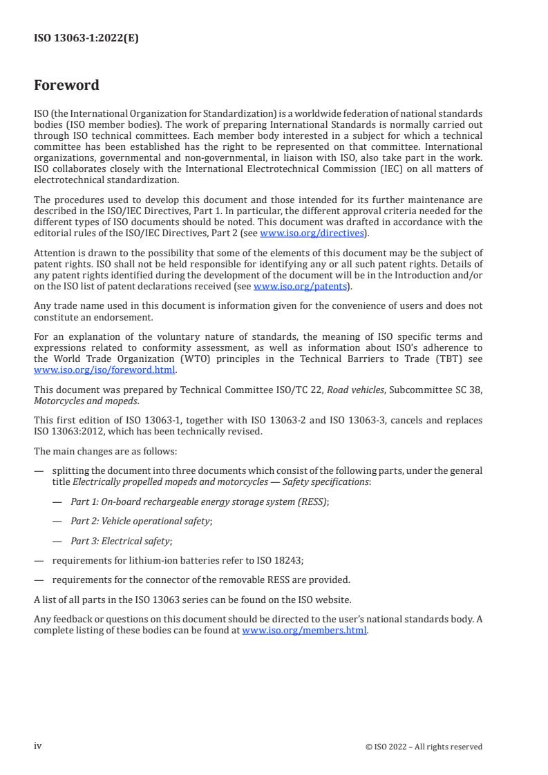 Keywords: ISO 13063-1, RESS, rechargeable energy storage system, electric mopeds, electric motorcycles, safety specifications.
