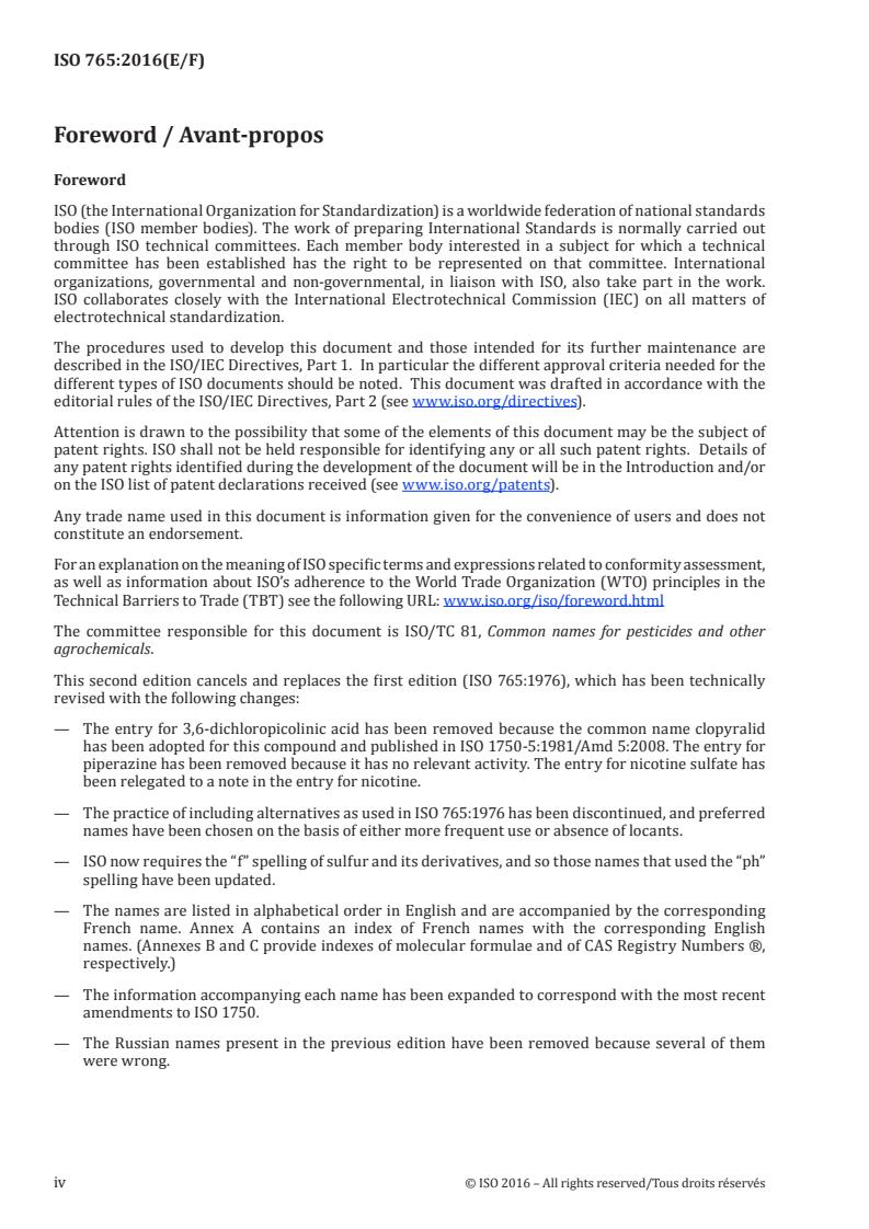 ISO 765:2016 - "Pesticides considered not to require common names" is an international standard that lists pesticide chemicals whose chemical or trivial names are already short and distinctive, so assigning a separate recommended common name is deemed unnecessary. Published as the second edition in 2016, ISO 765:2016 updates the original 1976 edition and is maintained by ISO/TC 81 (Common names for pesticides and other agrochemicals). The standard covers bilingual (English/French) entries and accompanies each name with authoritative identifiers such as IUPAC names, CAS registry numbers, molecular formulae, InChI/InChIKey and registration numbers.