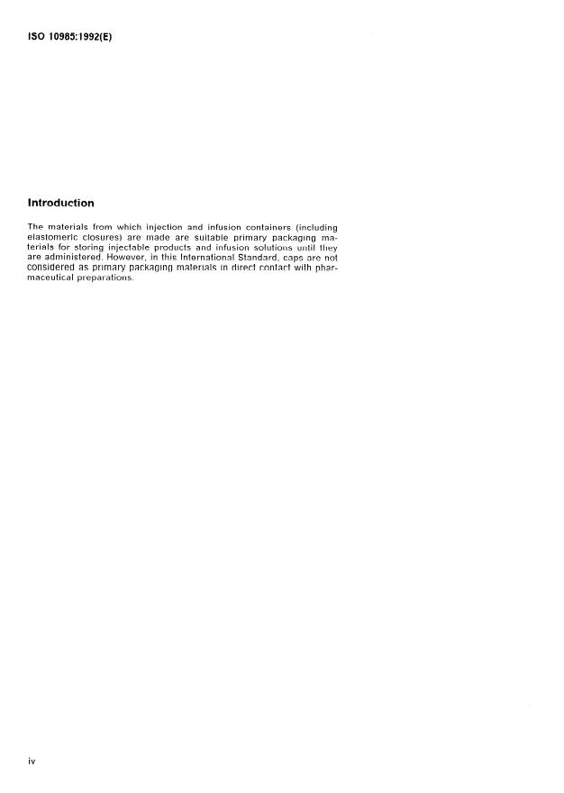 ISO 10985:1992 is a standard published by the International Organization for Standardization (ISO). Its full title is "Caps made of aluminium-plastics combinations for infusion bottles and injection vials — Requirements and test methods". This standard covers: Caps made of aluminium-plastics combinations for infusion bottles and injection vials — Requirements and test methods