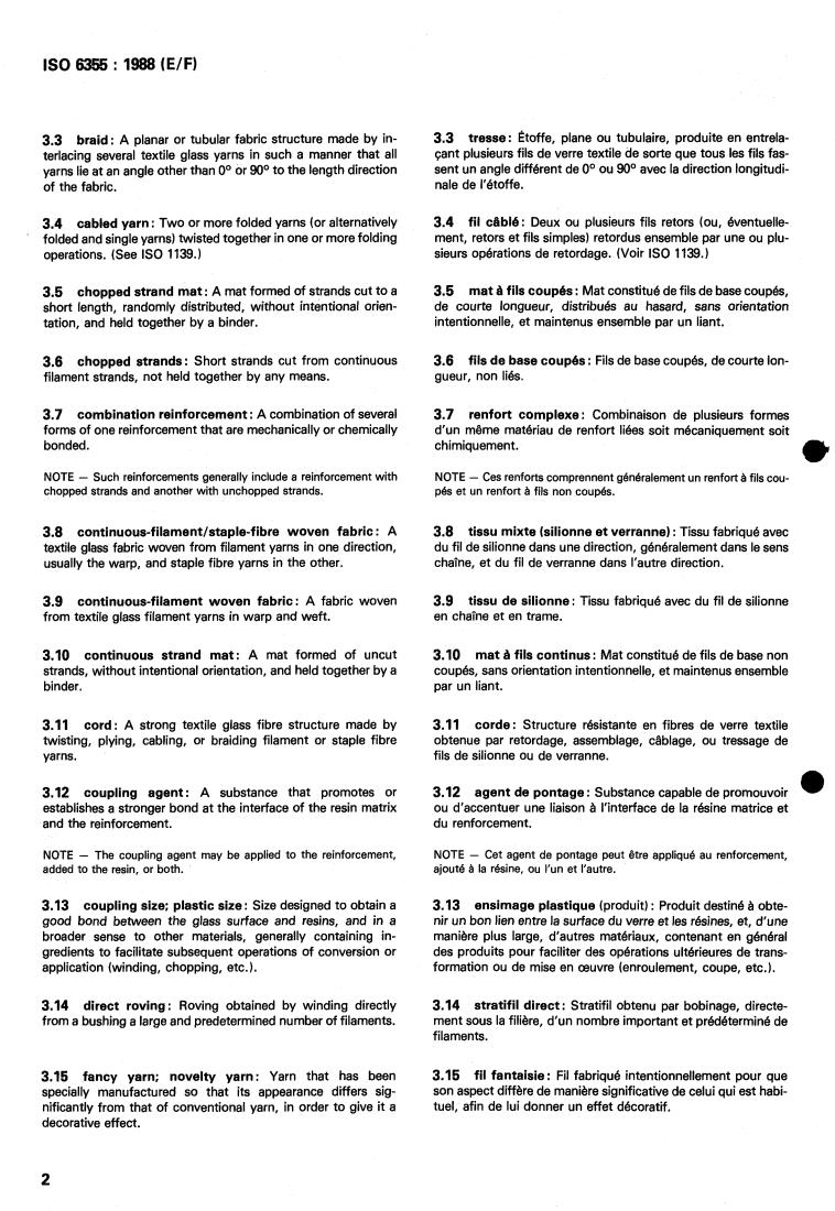 ISO 6355:1988 is a standard published by the International Organization for Standardization (ISO). Its full title is "Textile glass — Vocabulary". This standard covers: Textile glass — Vocabulary