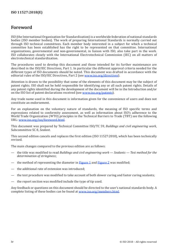 ISO 11527:2018 is a standard published by the International Organization for Standardization (ISO). Its full title is "Buildings and civil engineering works — Sealants — Test method for the determination of stringiness". This standard covers: This document specifies a method for the determination of the stringiness of a wet-applied one-component sealant.