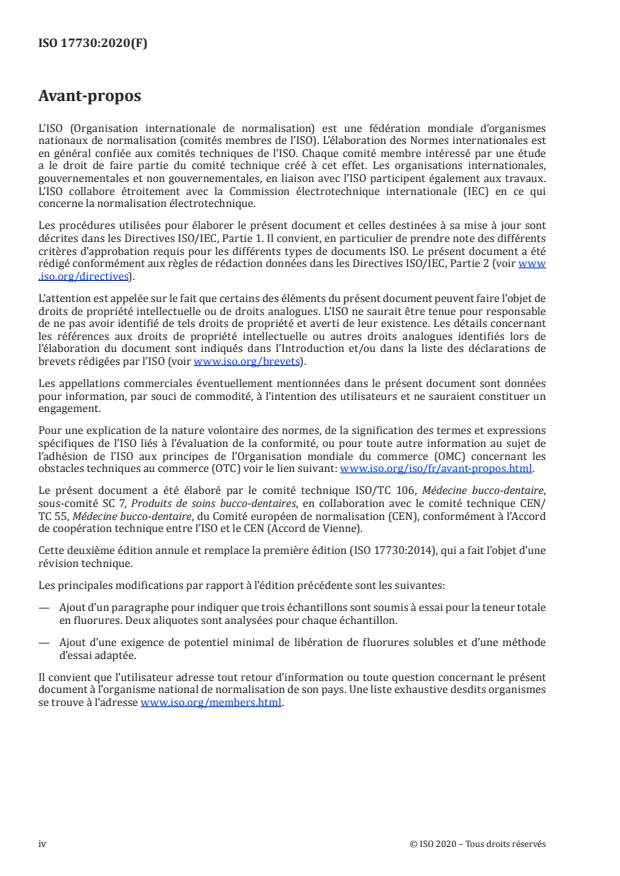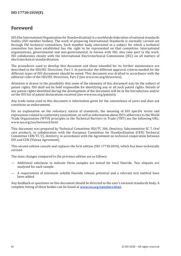 ISO 17730:2020 is a standard published by the International Organization for Standardization (ISO). Its full title is "Dentistry — Fluoride varnishes". This standard covers: This document specifies requirements and test methods for total digestible fluoride content and a minimum soluble fluoride release potential in dental varnishes containing fluoride, intended for use in the oral cavity directly on the outer surfaces of teeth and fillings. It also specifies packaging and labelling requirements, including the instructions for use. This document covers fluoride varnishes to be applied by dental health care workers.