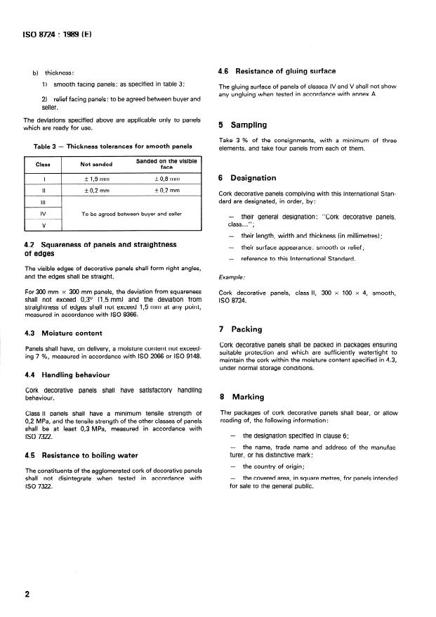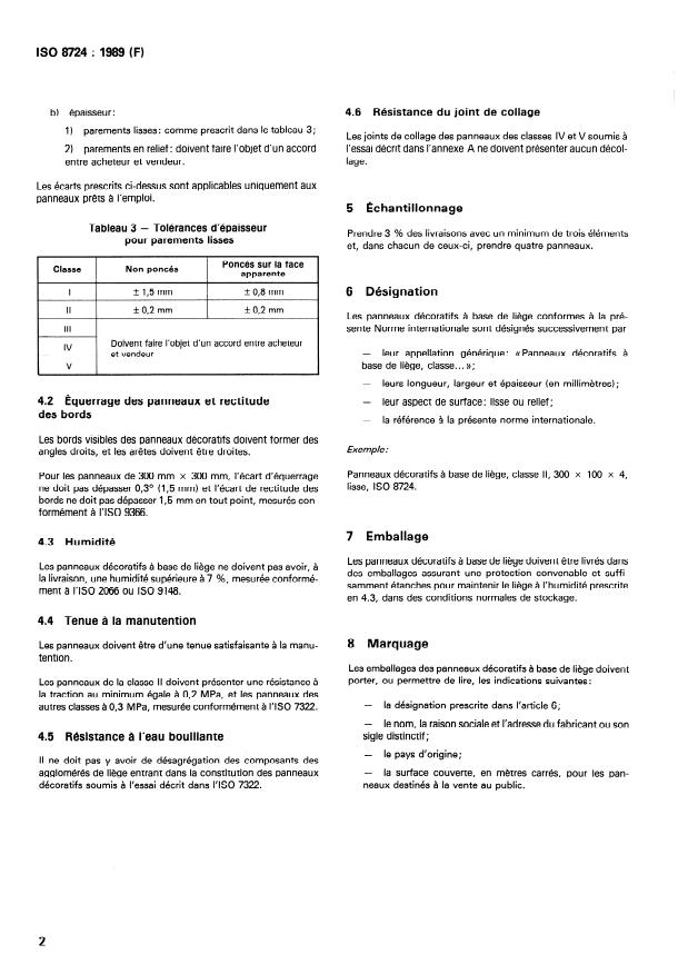 ISO 8724:1989 is a standard published by the International Organization for Standardization (ISO). Its full title is "Cork decorative panels — Specification". This standard covers: Applies to panels intended for covering internal walls which may be grouped into five classes according to their constitution (siehe ISO 633). Specifies the following characteristics: dimensions, squareness and straightness of edges, moisture content, handling behaviour, resistance to boiling water and resistance of glued joint which shall in the classes IV and V not show any unglueing when tested in accordance with Annex A.