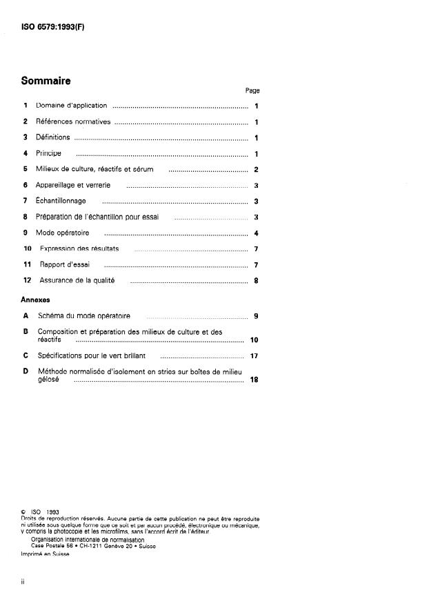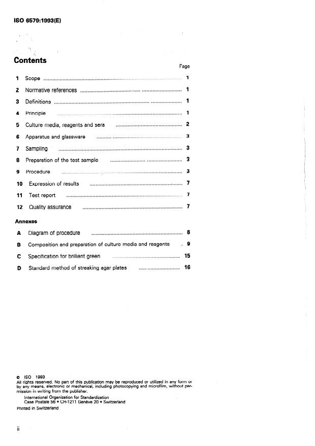 ISO 6579:1993 is a standard published by the International Organization for Standardization (ISO). Its full title is "Microbiology — General guidance on methods for the detection of Salmonella". This standard covers: The methods proposed necessitate four successive stages: pre-enrichment in non-selective liquid medium, enrichment in selective liquid media, plating out and recognition, confirmation. Annex A gives a diagram of the procedure, annex B describes composition and preparation of culture media and reagents, annex C specifies brilliant green.