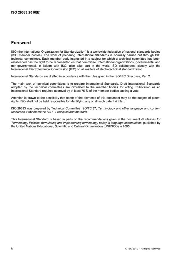 ISO 29383:2010 is a standard published by the International Organization for Standardization (ISO). Its full title is "Terminology policies — Development and implementation". This standard covers: ISO 29383:2010 provides policy makers in governments, administration, non-profit and commercial organizations with guidelines and a methodology for the development and implementation of a comprehensive policy or strategy concerning the planning and management of terminology. ISO 29383:2010 defines key concepts and describes scenarios and environments which may require different kinds of terminology policies. It also places terminology policies in the broader context of institutional strategic frameworks.