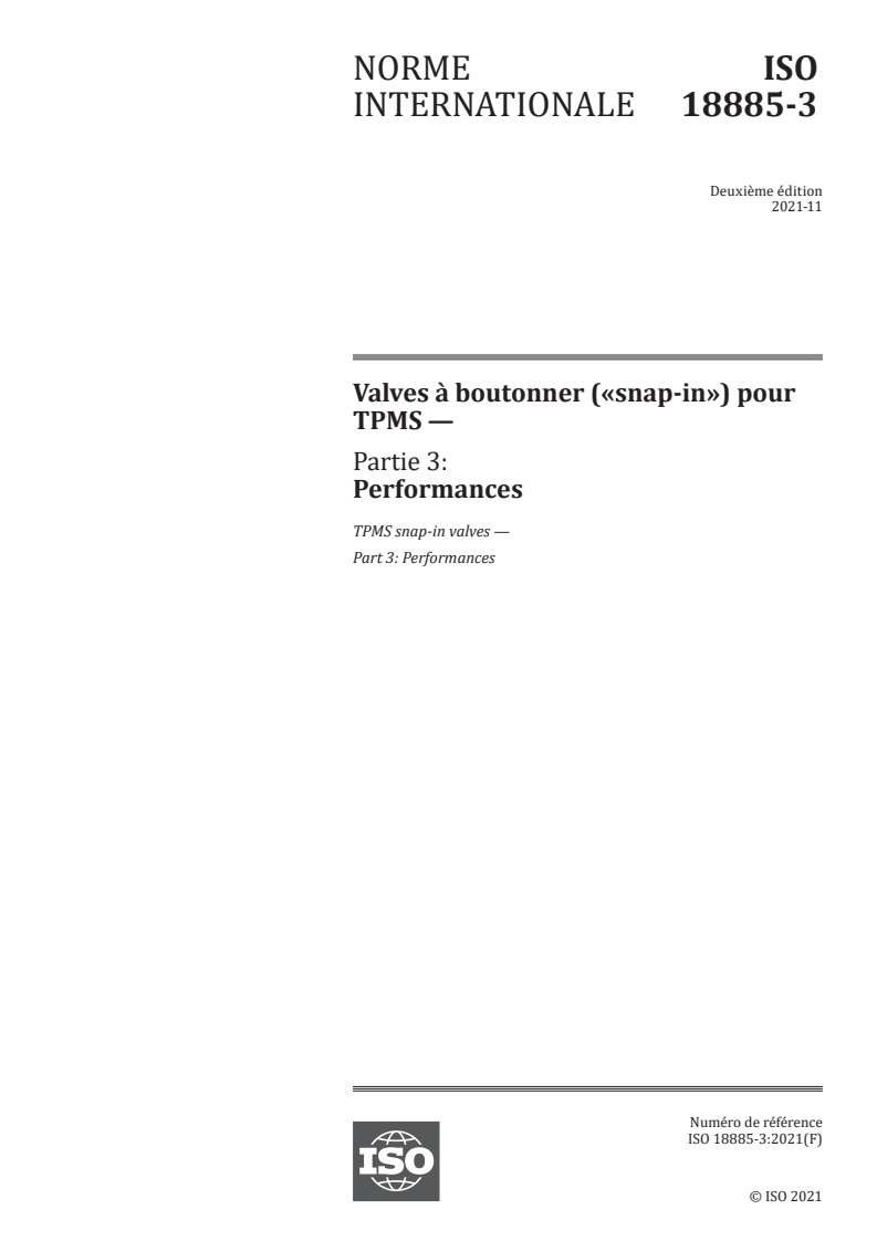 ISO 18885-3:2021 - TPMS snap-in valves — Part 3: Performances Released:11/30/2021