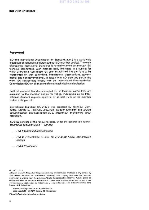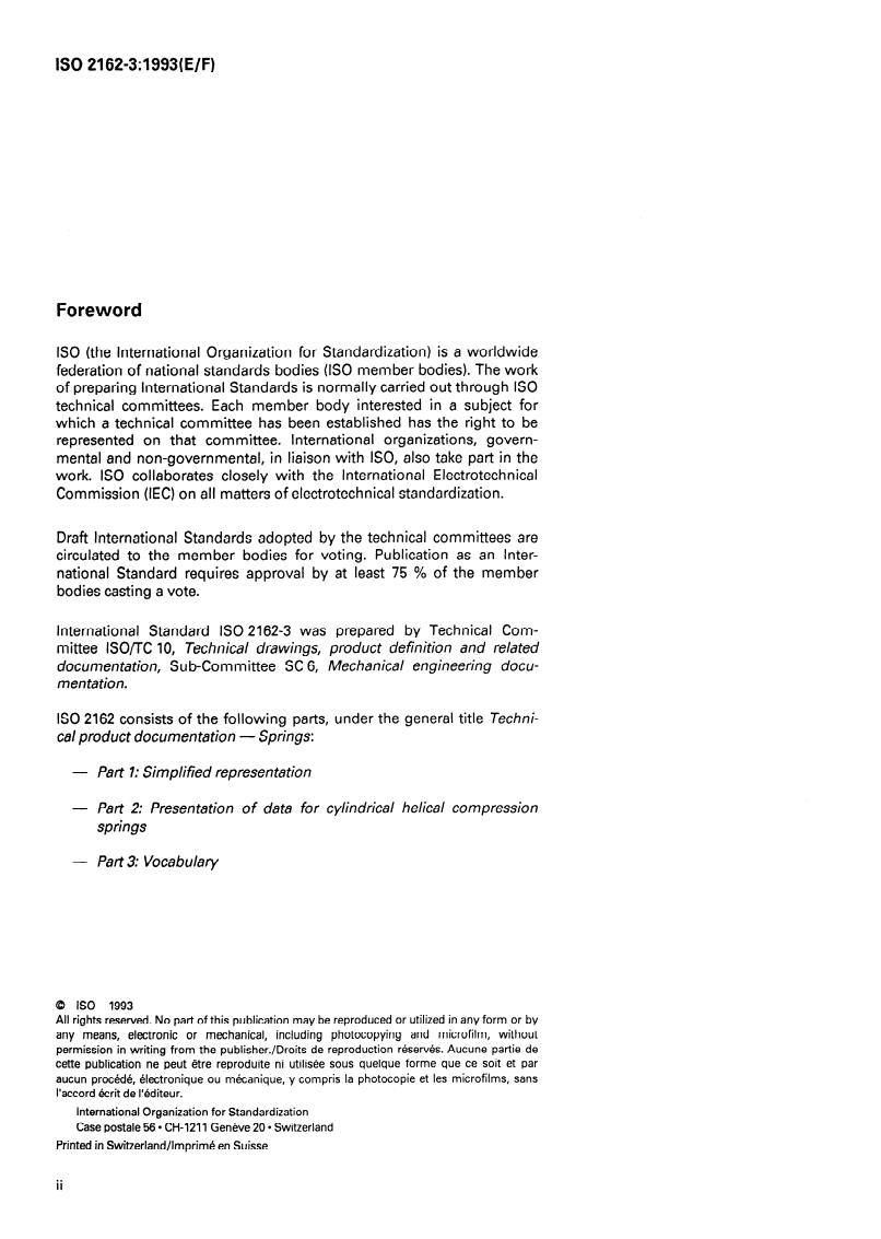 ISO 2162-3:1993 is a standard published by the International Organization for Standardization (ISO). Its full title is "Technical product documentation — Springs — Part 3: Vocabulary". This standard covers: Defines 33 terms in English and French for the description of springs and their characteristics to be used in technical product documentation.