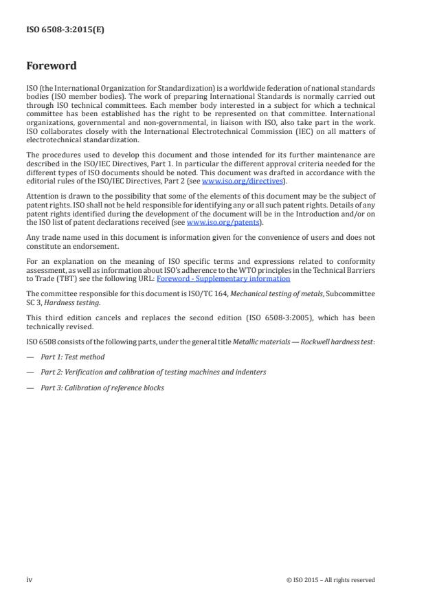 ISO 6508-3:2015 is a standard published by the International Organization for Standardization (ISO). Its full title is "Metallic materials — Rockwell hardness test — Part 3: Calibration of reference blocks". This standard covers: ISO 6508-3:2015 specifies a method for the calibration of reference blocks to be used for the indirect and daily verification of Rockwell hardness testing machines, as specified in ISO 6508‑2:2015. Attention is drawn to the fact that the use of hard metal for ball indenters is considered to be the standard type of Rockwell indenter ball. Steel indenter balls can be used only when complying with ISO 6508‑1:2015, Annex A.