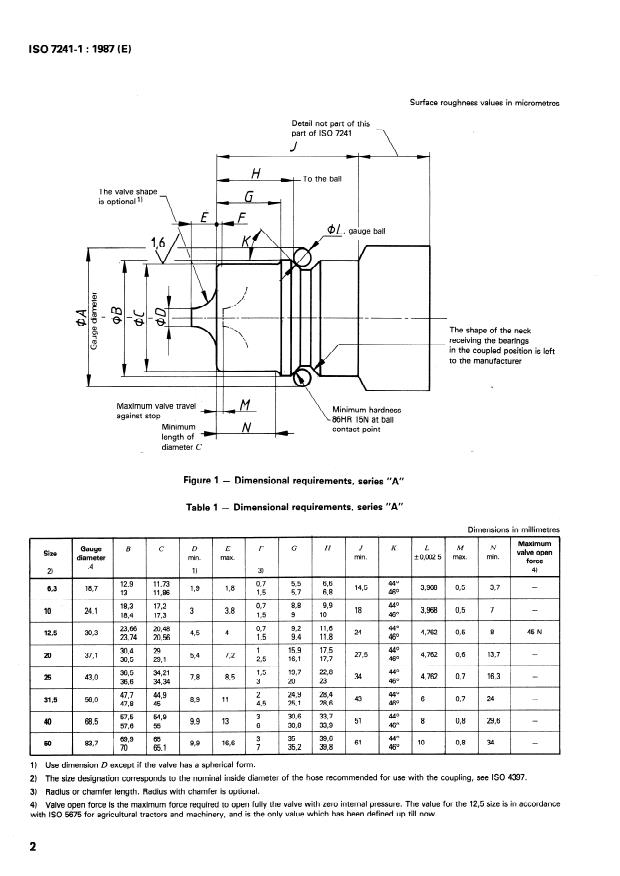 ISO 7241-1:1987 is a standard published by the International Organization for Standardization (ISO). Its full title is "Hydraulic fluid power — Quick-action couplings — Part 1: Dimensions and requirements". This standard covers: Lays down the interface dimensions and specifies basic performance requirements for two series of general-purpose quick-action couplings. Both series are in widespread use and have similar technological advantages. The distinction in usage is mainly geographical. Series "A" (covering sizes 6,3 to 50) is used predominantly in Europe and series "B" (covering sizes 5 to 50) is predominant in America.