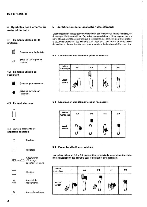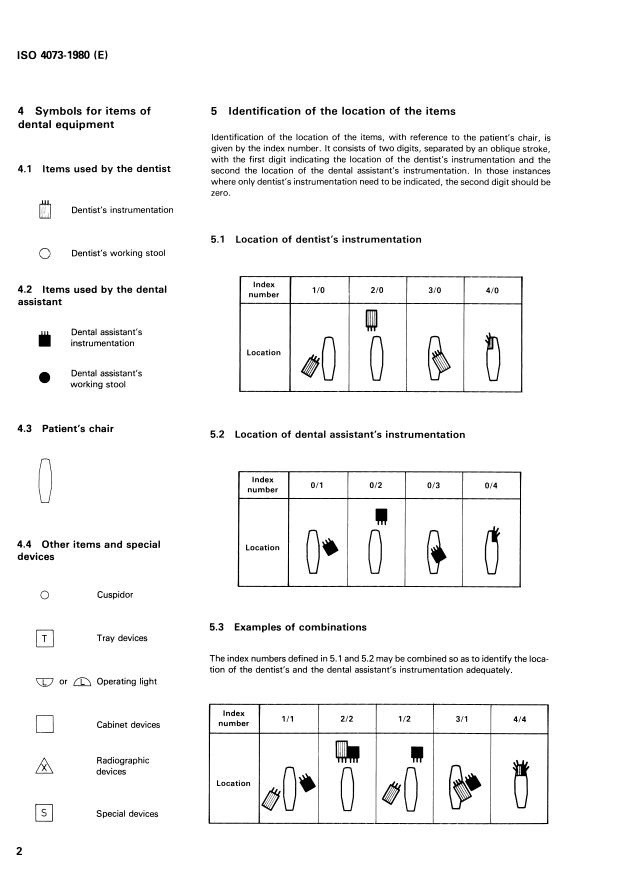 ISO 4073:1980 is a standard published by the International Organization for Standardization (ISO). Its full title is "Dental equipment — Items of dental equipment at the working place — Identification system". This standard covers: Lays down a reference plan for the location of items, it gives symbols for the items and a two-digit system for the identification of the combination of items which are used at the working place of a dental team where examination, treatment and other clinical procedures, with the patient direcly involved, are carried out.