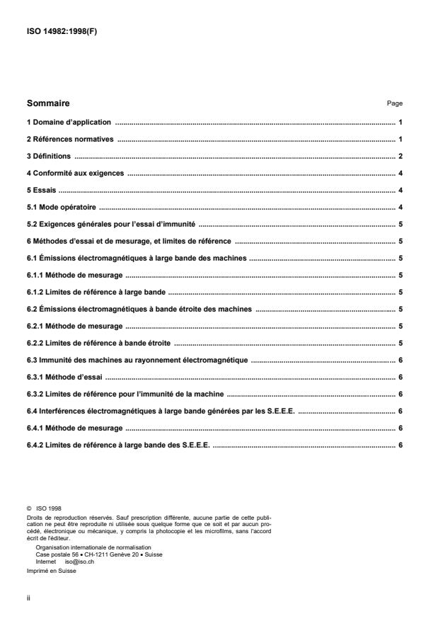 ISO 14982:1998 is a standard published by the International Organization for Standardization (ISO). Its full title is "Agricultural and forestry machinery - Electromagnetic compatibility - Test methods and acceptance criteria". This standard covers: Agricultural and forestry machinery - Electromagnetic compatibility - Test methods and acceptance criteria