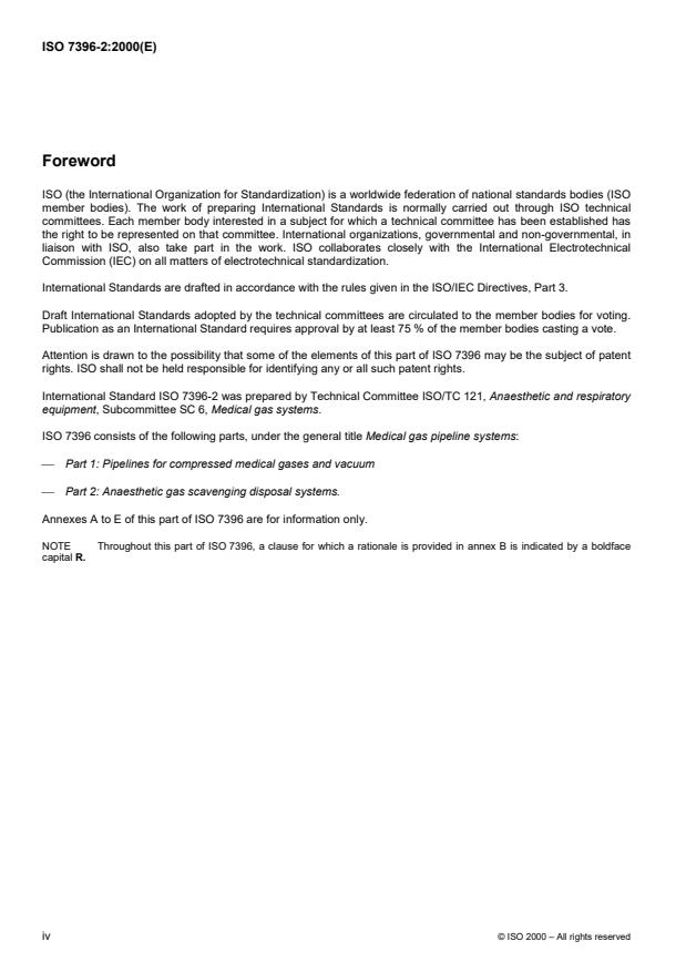 ISO 7396-2:2000 is a standard published by the International Organization for Standardization (ISO). Its full title is "Medical gas pipeline systems — Part 2: Anaesthetic gas scavenging disposal systems". This standard covers: Medical gas pipeline systems — Part 2: Anaesthetic gas scavenging disposal systems