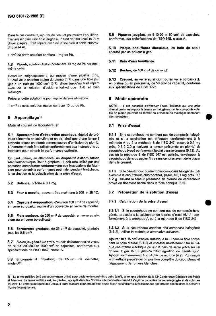 ISO 6101-2:1986 is a standard published by the International Organization for Standardization (ISO). Its full title is "Rubber — Determination of metal content — Flame atomic absorption spectrometric method — Part 2: Determination of lead content". This standard covers: Rubber — Determination of metal content — Flame atomic absorption spectrometric method — Part 2: Determination of lead content