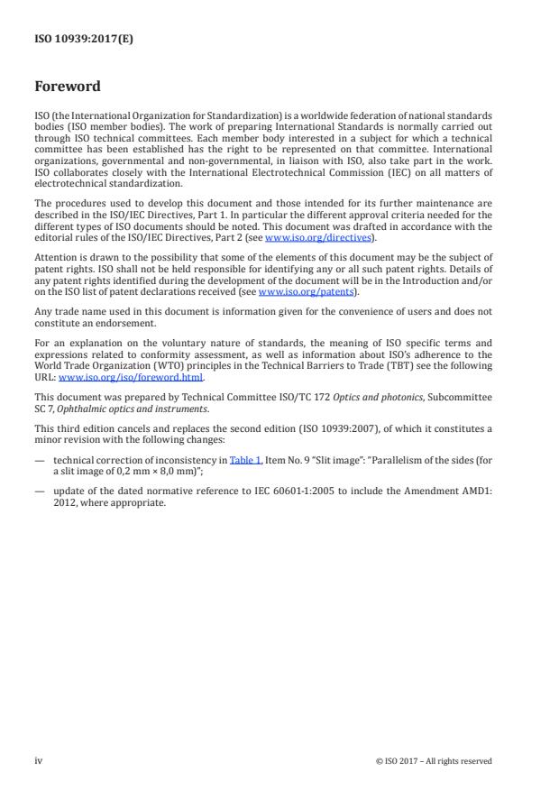 ISO 10939:2017, together with ISO 15004‑1 and ISO 15004‑2, specifies requirements and test methods for slit-lamp microscopes to provide slit illumination and observation under magnification of the eye and its adnexa. ISO 10939:2017 is not applicable to microscope accessories, e.g. photographic equipment and lasers. ISO 10939:2017 takes precedence over ISO 15004‑1 and ISO 15004‑2, if differences exist.