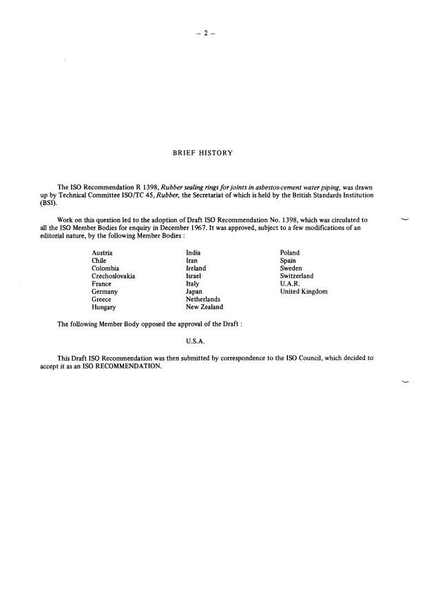 IS0 Recommendation R 1398, Rubber sealing rings for joints in asbestos-cement water piping, was drawn