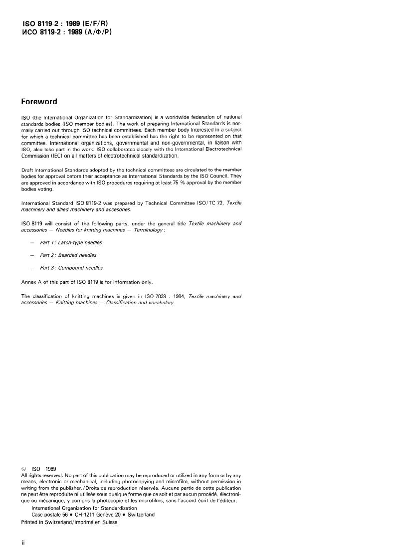 ISO 8119-2:1989 is a standard published by the International Organization for Standardization (ISO). Its full title is "Textile machinery and accessories - Needles for knitting machines - Terminology - Part 2: Bearded needles". This standard covers: This part of ISO 8119 gives, in English, French and Russian (in the annex in German), the terminolgy relating to bearded needles. Bearded needles are a type of knitting element. Gives a definition of these needles. Completed by corresponding illustrations.