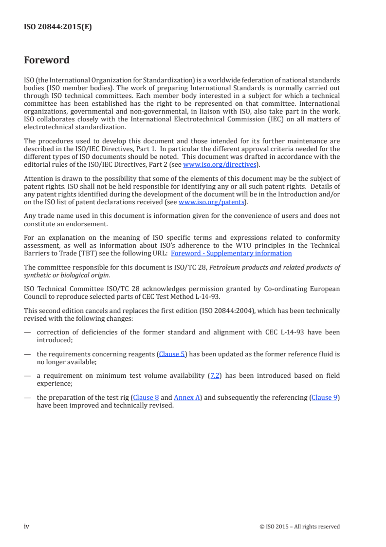 ISO 20844:2015 is a standard published by the International Organization for Standardization (ISO). Its full title is "Petroleum and related products — Determination of the shear stability of polymer-containing oils using a diesel injector nozzle". This standard covers: ISO 20844:2015 specifies a method to assess the resistance to shear stresses applied to mineral oils, synthetic oils, and other fluids containing polymers, when passed through a specified diesel injector nozzle. The shear stability is measured by the change in viscosity of the fluid under test, brought about by the polymer degradation during stress. Under normal circumstances, this International Standard is applied to hydraulic fluids of categories HR and HV as defined in ISO 6743‑4[1] and specified in ISO 11158 [2], but it may also be applied to fire-resistant hydraulic fluids within categories HFA, HFB, HFC, and HFD, with modified conditions as specified in ISO 12922[3]. No formal correlation has been established between the viscosity loss, or the absence of viscosity loss, obtained using the procedures described in this International Standard and that of oils and fluids in actual service. However, it provides standardized conditions for the evaluation of polymer stability under minimized thermal and oxidative stresses. It is normally used by manufacturers of fluids and additives, and users, as a means of ranking existing and potential formulations. NOTE Changes to properties other than viscosity are specified in some specifications, but these are not covered by the procedures specified in this International Standard.
