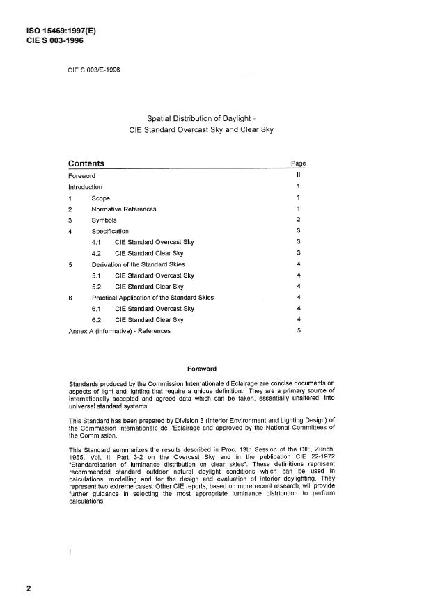 ISO 15469:1997 is a standard published by the International Organization for Standardization (ISO). Its full title is "Spatial distribution of daylight — CIE standard overcast sky and clear sky". This standard covers: Spatial distribution of daylight — CIE standard overcast sky and clear sky