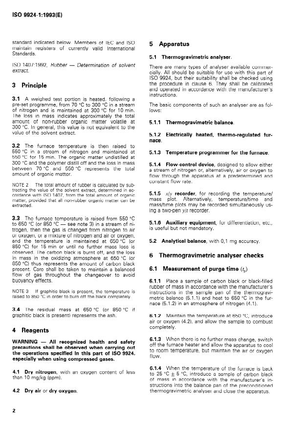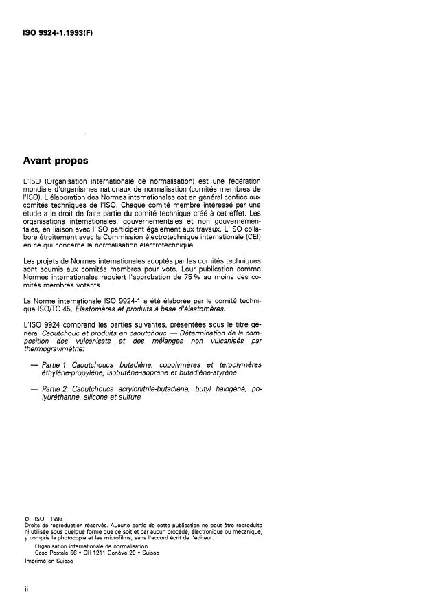 ISO 9924-1:1993 is a standard published by the International Organization for Standardization (ISO). Its full title is "Rubber and rubber products — Determination of the composition of vulcanizates and uncured compounds by thermogravimetry — Part 1: Butadiene, ethylene-propylene copolymer and terpolymer, isobutene-isoprene, isoprene and styrene-butadiene rubbers". This standard covers: Rubber and rubber products — Determination of the composition of vulcanizates and uncured compounds by thermogravimetry — Part 1: Butadiene, ethylene-propylene copolymer and terpolymer, isobutene-isoprene, isoprene and styrene-butadiene rubbers