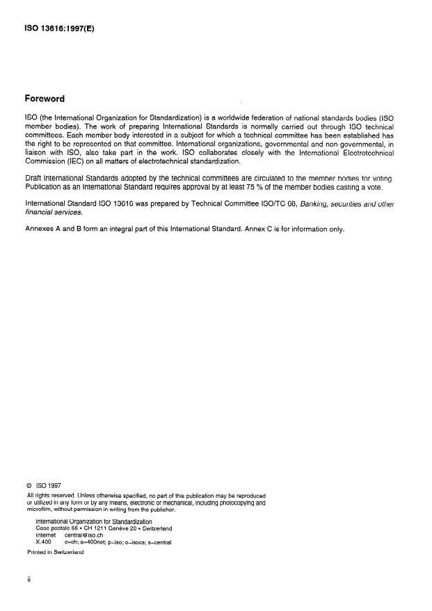 International Standard IS0 13616 was prepared by Technical Committee lSO/TC 68, Banking, securities and other