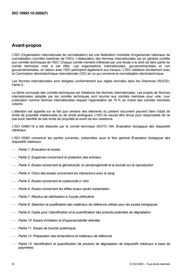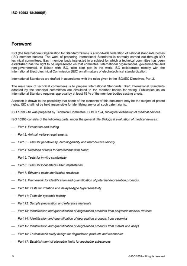 ISO 10993-18:2005 describes a framework for the identification of a material and the identification and quantification of its chemical constituents. The chemical characterization information generated can be used for a range of important applications, for example, as part of an assessment of the overall biological safety of a medical device (ISO 10993-1 and 14971), as a measurement of the level of a leachable substance in a medical device in order to allow the assessment of compliance with the allowable limit derived for that substance from health based risk assessment (ISO 10993-17), for judging equivalence of a proposed material to a clinically established material, for judging equivalence of a final device to a prototype device to check the relevance of data on the latter to be used to support the assessment of the former, or for screening of potential new materials for suitability in a medical device for a proposed clinical application. ISO 10993-18:2005 does not address the identification or quantification of degradation products, which is covered in ISO 10993-9, ISO 10993-13, ISO 10993-14 and ISO 10993-15. The ISO 10993 series of standards is applicable when the material or device comes into contact with the body directly or indirectly (see 4.2.1 of ISO 10993-1). ISO 10993-18:2005 is intended for suppliers of materials and manufacturers of medical devices, when carrying out a biological safety assessment.