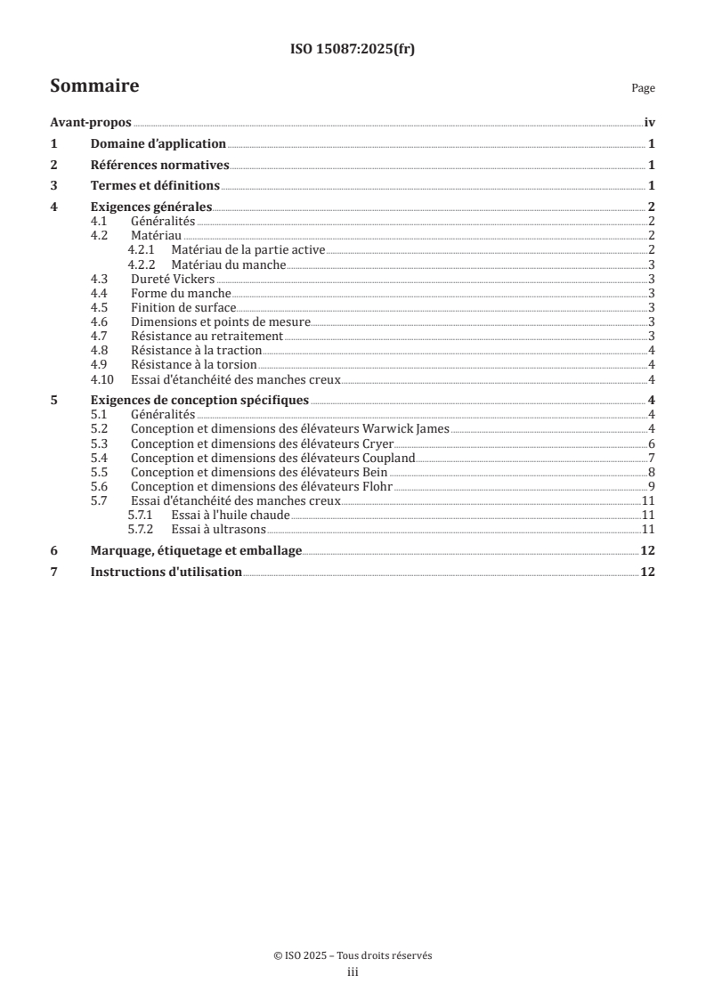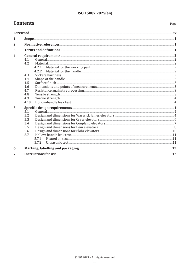 ISO 15087:2025 is a standard published by the International Organization for Standardization (ISO). Its full title is "Dentistry - Dental elevators". This standard covers: This document specifies general requirements and test methods for metallic dental elevators. In addition, it specifies dimensional requirements for specific types of dental elevators such as Warwick James elevators, Cryer elevators, Coupland elevators, Bein elevators and Flohr elevators.