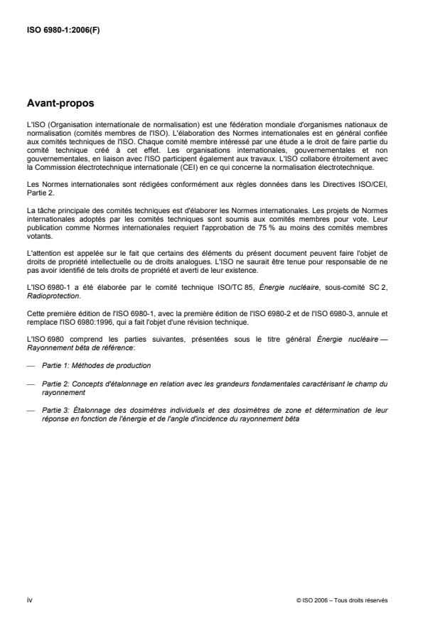 L'ISO 6980-1:2006 spécifie les exigences relatives aux champs de rayonnement bêta produits par les sources de radionucléides utilisées pour l'étalonnage des dosimètres de zone, des dosimètres individuels et des débitmètres de dose à utiliser pour la détermination des grandeurs Hp(0,07) et H'(0,07), ainsi qu'à la détermination de leur réponse en fonction de l'énergie et de l'angle d'incidence des particules bêta. Elle donne les caractéristiques des radionucléides utilisés pour produire les champs de rayonnement bêta de référence, donne également des exemples de construction de sources adaptées et décrit des méthodes de mesure de l'énergie maximale résiduelle des particules bêta et du débit d'équivalent de dose à la profondeur de 0,07 mm dans la sphère ICRU (Commission Internationale des Unités et Mesures de Rayonnement). La plage d'énergie concernée se situe entre 66 keV et 3,6 MeV et les débits d'équivalent de dose sont compris entre 10-5 Sv h-1 environ et au moins 10 Sv h-1. Pour certaines sources, les variations du débit d'équivalent de dose sont également données en fonction de l'angle d'incidence du rayonnement. L'ISO 6980-1:2006 propose deux séries de champs de rayonnement bêta de référence parmi lesquels sera sélectionné le rayonnement nécessaire pour déterminer les caractéristiques (étalonnage et dépendance énergétique et angulaire de la réponse) d'un instrument. Les champs de rayonnement de référence de la série 1 sont produits par des sources de radionucléides utilisées avec des filtres égalisateurs de faisceau conçus pour qu'à une distance spécifiée les débits d'équivalent de dose soient uniformes sur une large zone. Les sources proposées de 90Sr + 90Y, 85Kr, 204Tl et 147Pm produisent des débits d'équivalent de dose maximaux d'environ 200 mSv h-1. Les champs de rayonnement de référence de la série 2 sont produits sans interposition de filtres égalisateurs de faisceau, ce qui permet d'avoir des sources planes de grande surface et une gamme de distances entre la source et le plan d'étalonnage. À proximité des sources, le débit de dose est uniforme seulement dans des zones relativement petites mais cette série présente l'avantage d'étendre les plages d'énergie et de débits de dose au-delà de celles de la série 1. Les radionucléides utilisés sont ceux de la série 1 plus les radionucléides 14C et 106Ru + 106Rh. Ces sources produisent des débits d'équivalent de dose allant jusqu'à 10 Sv h-1.