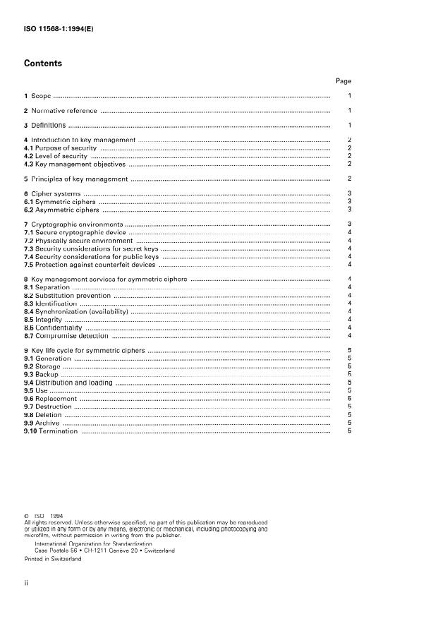 ISO 11568-1:1994 is a standard published by the International Organization for Standardization (ISO). Its full title is "Banking — Key management (retail) — Part 1: Introduction to key management". This standard covers: Specifies the principles for the management of keys used in cipher systems implemented within the retail banking environment. Applies both to the keys of symmetric cipher systems and to the secret and public keys of asymmetric cipher systems. Appropriate for use by financial institutions and other organizations engaged in the area of retail financial services, where the interchange of information requires confidentiality, integrity, or authentication.
