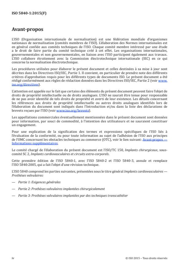 ISO 5840-1:2015 is a standard published by the International Organization for Standardization (ISO). Its full title is "Cardiovascular implants — Cardiac valve prostheses — Part 1: General requirements". This standard covers: ISO 5840-1:2015 is applicable to heart valve substitutes intended for human implantation and provides general requirements. Subsequent parts of the ISO 5840?series provide specific requirements. ISO 5840-1:2015 is applicable to both newly developed and modified heart valve substitutes and to the accessories, packaging, and labelling required for their implantation and for determining the appropriate size of the heart valve substitute to be implanted. ISO 5840-1:2015 outlines an approach for qualifying the design and manufacture of a heart valve substitute through risk management. The selection of appropriate qualification tests and methods are derived from the risk assessment. The tests may include those to assess the physical, chemical, biological, and mechanical properties of heart valve substitutes and of their materials and components. The tests may also include those for preclinical in vivo evaluation and clinical evaluation of the finished heart valve substitute. ISO 5840-1:2015 defines operational conditions for heart valve substitutes. ISO 5840-1:2015 excludes homografts. NOTE A rationale for the provisions of this part of ISO 5840 is given in Annex A.