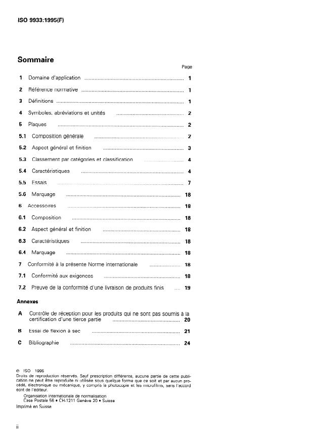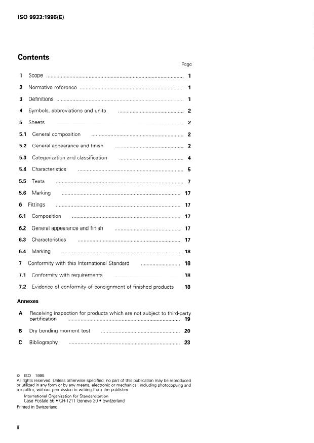 ISO 9933:1995 is a standard published by the International Organization for Standardization (ISO). Its full title is "Products in fibre-reinforced cement — Long corrugated or asymmetrical section sheets and fittings for roofing and cladding". This standard covers: Lays down the technical characteristics of straight fibre-cement profiled sheets, of more than 0,9 m length, and their fibre-cement fittings used as roofing and cladding materials. Also specifies tests for checking these characteristics as well as marking and conditions of acceptance. Does not apply to asbestos-cement corrugated or profiled sheets, nor to short fibre-cement sheets.