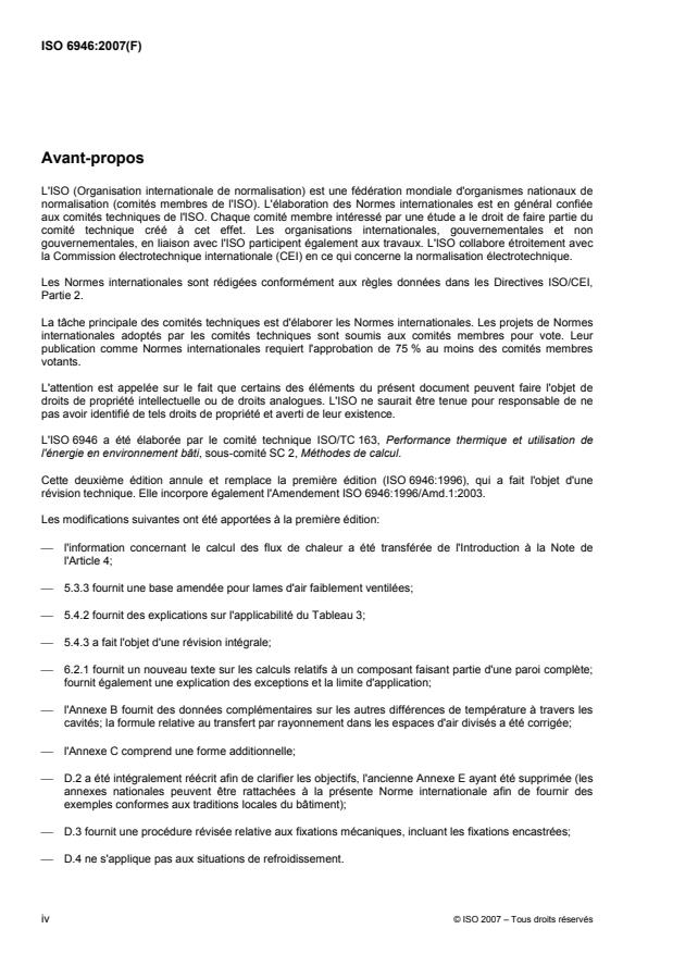 L'ISO 6946:2007 fournit la méthode de calcul de la résistance thermique et du coefficient de transmission thermique des composants et parois de bâtiments, à l'exclusion des portes, des fenêtres et autres parois vitrées, des murs-rideaux, des composants qui mettent en jeu un transfert de chaleur vers le sol et des composants parcourus par l'air de ventilation du bâtiment. La méthode de calcul est basée sur les conductivités thermiques utiles ou résistances thermiques utiles appropriées des matériaux et produits pour l'application concernée. La méthode s'applique aux composants et parois constitués de couches thermiquement homogènes (qui peuvent comprendre des lames d'air). L'ISO 6946:2007 fournit aussi une méthode approchée, qui peut être appliquée pour les parois comportant des couches hétérogènes et qui tient compte de l'effet des fixations métalliques, par l'utilisation d'un terme de correction. Les autres cas, où l'isolation est traversée par du métal, sont en dehors du domaine d'application de la l'ISO 6946:2007.