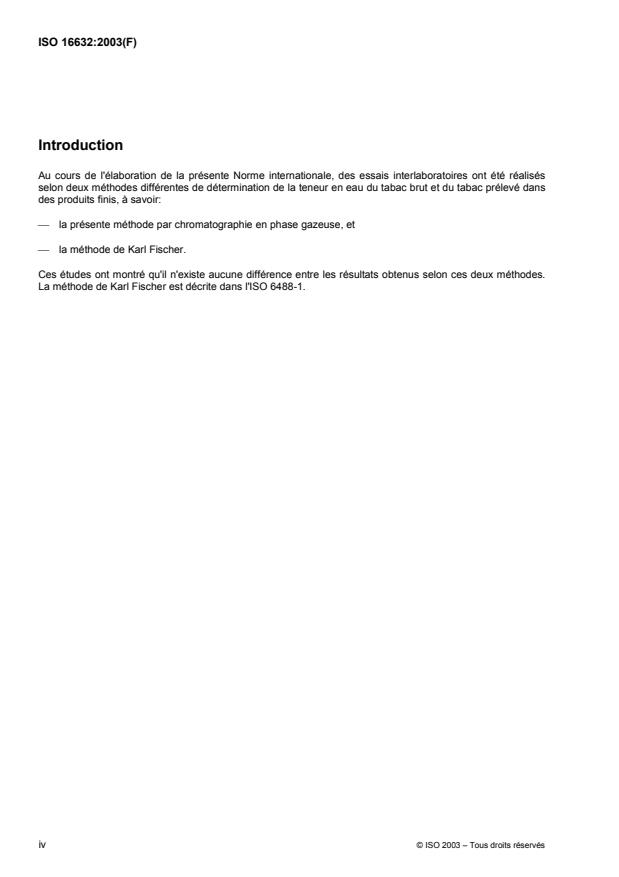 ISO 16632:2003 specifies a gas-chromatographic method for the determination of water content. It is applicable to raw tobacco as well as tobacco taken from finished products. The method is suitable for water contents ranging at least from a mass fraction of 2 percent to 55 percent.