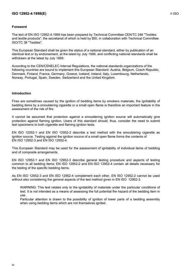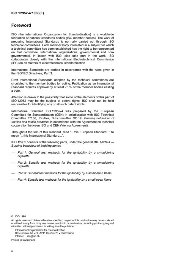 ISO 12952-4:1998 is a standard published by the International Organization for Standardization (ISO). Its full title is "Textiles — Burning behaviour of bedding items — Part 4: Specific test methods for the ignitability by a small open flame". This standard covers: Textiles — Burning behaviour of bedding items — Part 4: Specific test methods for the ignitability by a small open flame