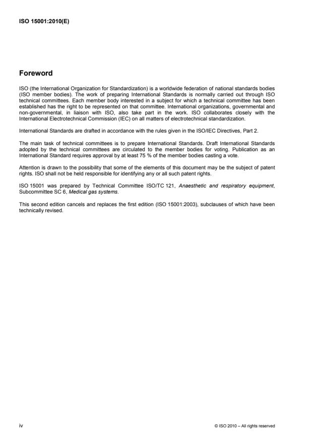ISO 15001:2010 is a standard published by the International Organization for Standardization (ISO). Its full title is "Anaesthetic and respiratory equipment - Compatibility with oxygen". This standard covers: ISO 15001:2010 specifies requirements for the oxygen compatibility of materials, components and devices for anaesthetic and respiratory applications, which can come into contact with oxygen in normal condition or in single fault condition at gas pressures greater than 50 kPa. Additionally, ISO 15001:2010 gives general guidelines for the selection of materials and components based on available data on their oxygen compatibility, and for carrying out a risk analysis, including addressing the toxicity of products of combustion and/or decomposition. Aspects of compatibility that are addressed by ISO 15001:2010 include cleanliness, resistance to ignition and the toxicity of products of combustion and/or decomposition at the design, manufacturing, maintenance and disposal stages. ISO 15001:2010 is applicable to anaesthetic and respiratory equipment that is within the scope of ISO/TC 121, e.g. medical gas pipeline systems, pressure regulators, terminal units, medical supply units, flexible connections, flow-metering devices, anaesthetic workstations and lung ventilators.