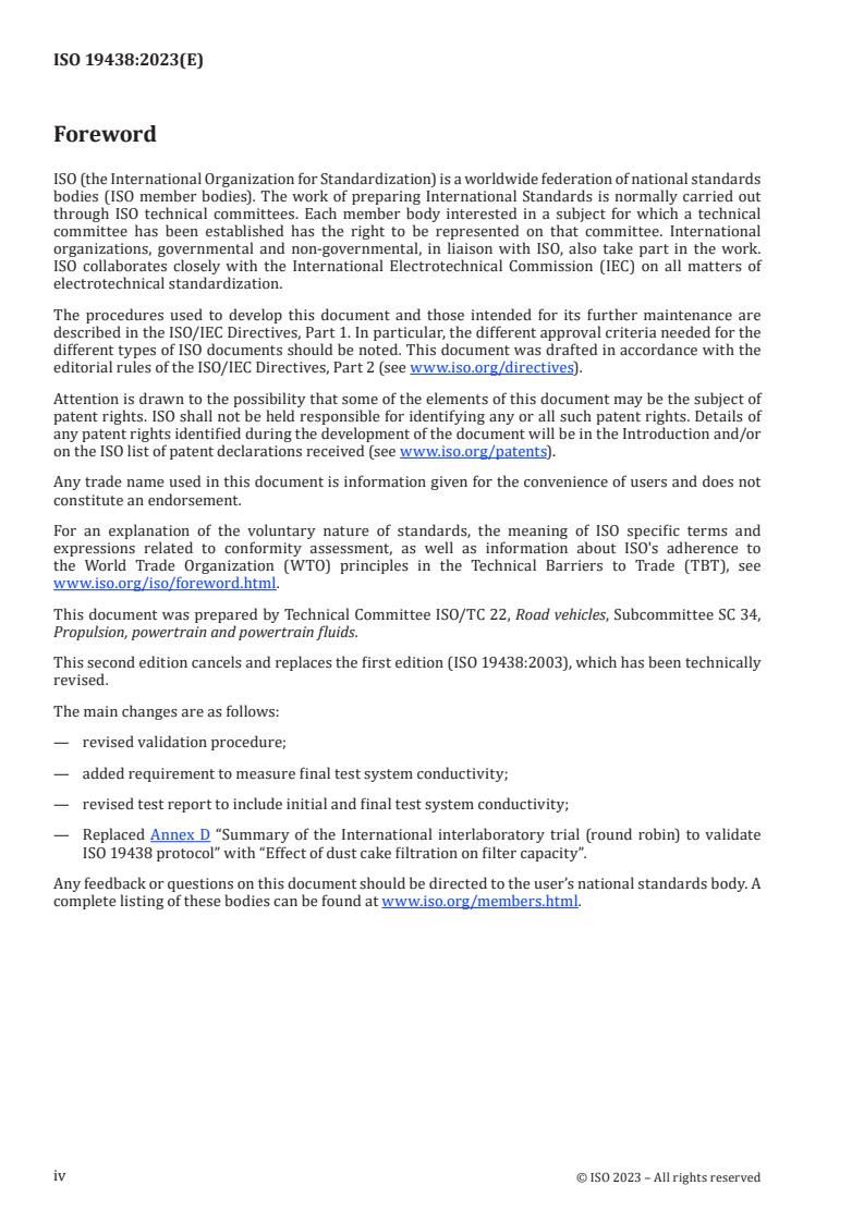 ISO 19438:2023 offers a robust framework for evaluating the filtration efficiency of diesel fuel and petrol filters utilized in internal combustion engines. The comprehensive standard encompasses a multi-pass filtration test, coupled with continuous contaminant injection and on-line particle counting methods. This structured approach not only facilitates accurate performance assessment but also helps in understanding the filtration characteristics and contaminant retention capacity of the filters. One of the notable strengths of ISO 19438:2023 is its detailed methodology, which provides clear guidelines for determining particulate removal characteristics and differential pressure under a controlled constant flow rate of test liquid. This precision in testing enables manufacturers to evaluate filter performance accurately, ensuring that diesel and petrol filters meet necessary specifications and operational demands. Furthermore, the flexibility of the standard is a significant advantage. It accommodates filter elements with a rated flow of 50 l/h to 800 l/h, while also allowing for modifications that enable testing of fuel filters with higher flow rates through mutual agreement between manufacturers and customers. This adaptability enhances the standard's relevance across various applications within the industry, making it a critical reference for filter manufacturers looking to ensure quality and compliance with performance standards. ISO 19438:2023 stands as an essential document in the field of fuel filtration, providing both OEMs and aftermarket suppliers with the necessary tools to assure the reliability and functionality of diesel fuel and petrol filters for internal combustion engines. Its emphasis on empirical testing and clear performance criteria ensures that stakeholders can confidently assess filter capabilities, supporting advancements in fuel systems and engine performance.